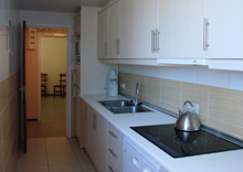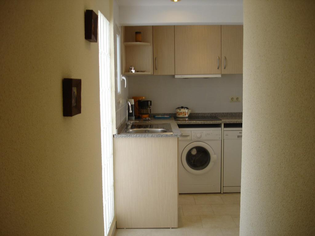 - Cocina americana (con lavadora, lavaplatos, magnetrón, nevera, placa eléctrica, cafetera, vajilla)